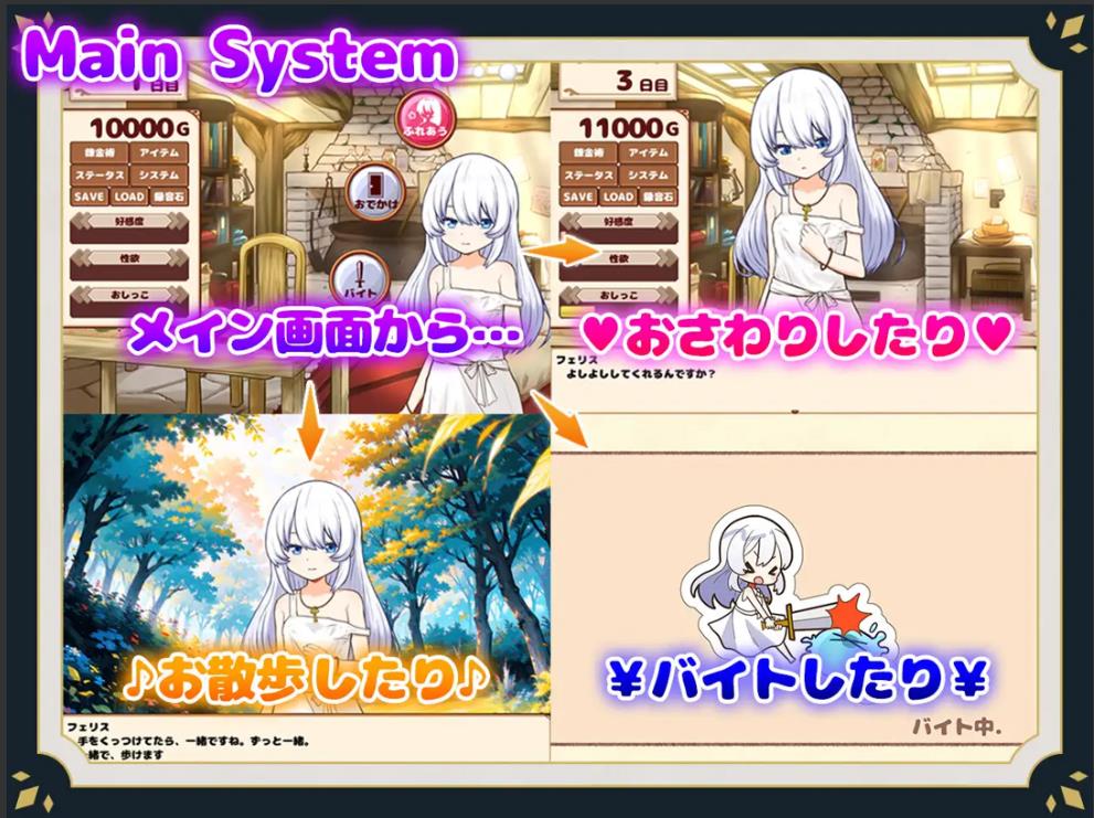 一起外出散步、打工赚取报酬、动手炼金制作道具,享受丰富多彩的互动体验。