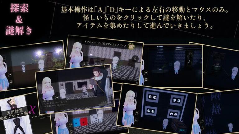 《天川纱雪与屋邸的九怪奇》是一款操作简便、横版卷轴式的色情探索恐怖游戏。